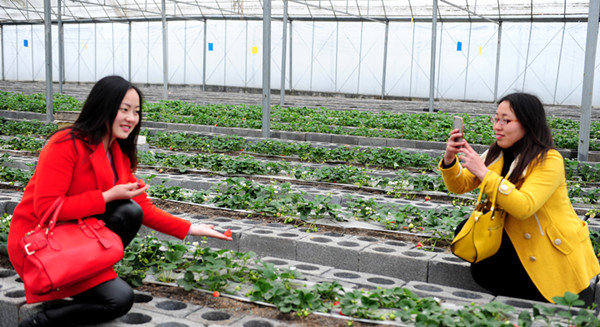 在草莓温棚里,一片生机勃勃,翠绿的叶子、鲜红欲滴的草莓、芬芳的果香沁人心脾。美女们一边拍照一边采访,欢乐的笑声溢满大棚。