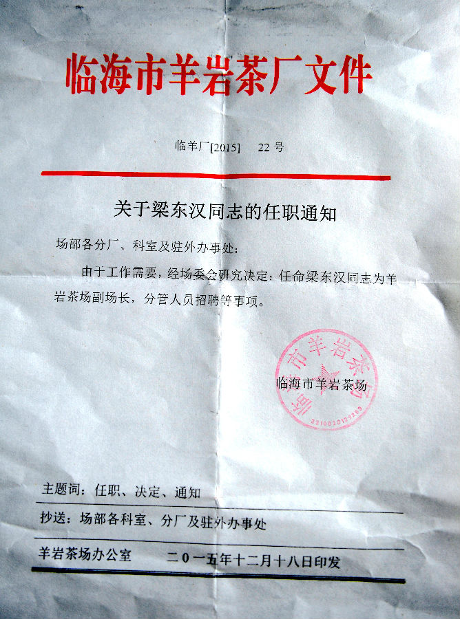 谈起梁东汉,临海羊岩茶场场长、羊岩茶叶有限公司董事长朱昌才赞誉有加:“十几年来,梁东汉把临海当成自己的第二故乡,把羊岩茶场看成自己的家,他对这里的山山水水、一草一木融入了感情。羊岩茶场经过多年的发展,在全省、全国已经颇具名气。企业的发展壮大无不凝聚着他的心血与汗水。我们任命梁东汉为羊岩茶场副场长,是对他的认可与褒奖。”