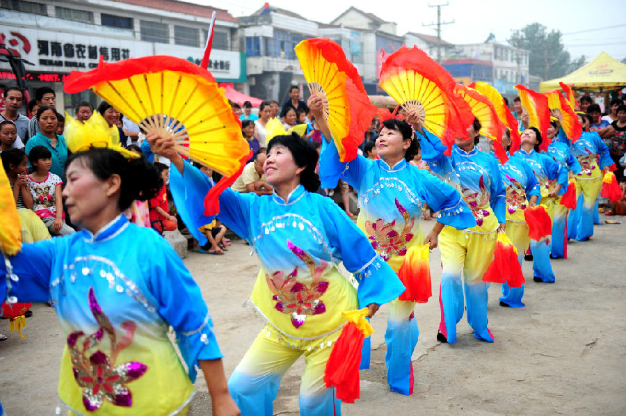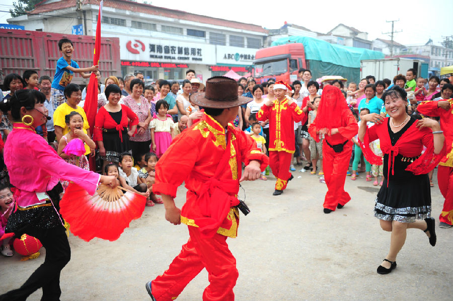 为了庆祝中国共产党成立93周年,6月29日,新蔡县农民舞蹈队———砖店镇天天乐舞蹈队举行庆“七一”文艺演出。演出吸引了数千名群众驻足观看,现场掌声、欢笑声此起彼伏。