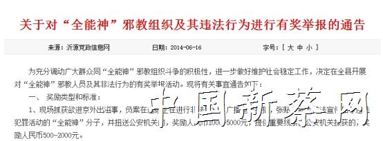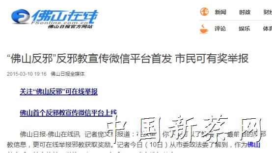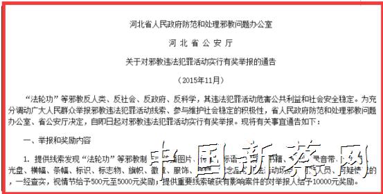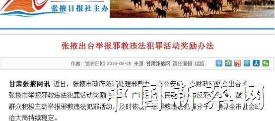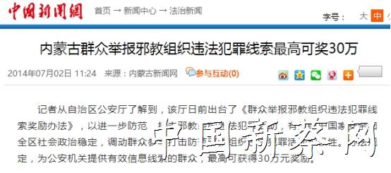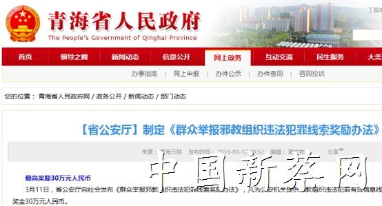 2016年3月11日,青海省公安厅发布了《群众举报邪教组织违法犯罪线索奖励办法》,该《办法》规定,群众举报邪教组织违法犯罪线索最高可获得30万元奖励。此前,内蒙古、河北也发布过类似奖励办法