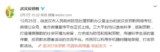 据了解,群众一旦发现或知悉邪教组织违法犯罪信息,可以通过“110”报警电话、当地反邪教微博、微信公众平台或者直接到公安机关等多种渠道进行举报。举报内容应尽可能具体、详实。